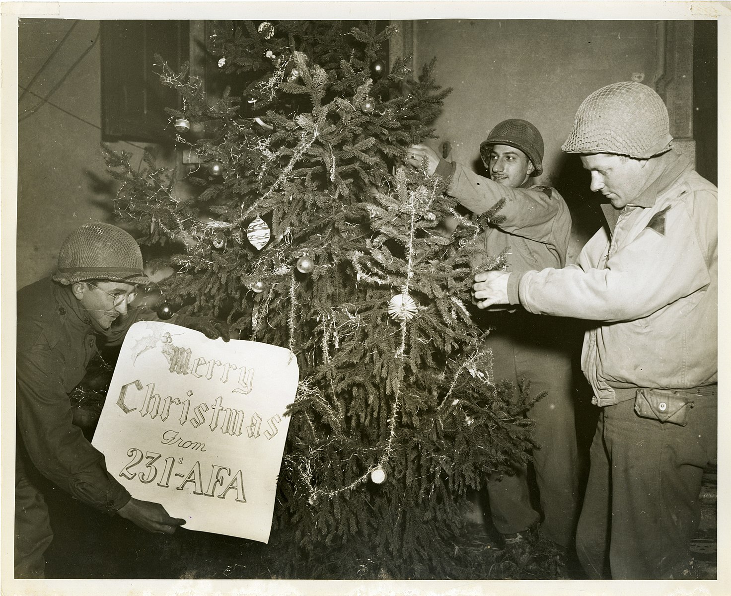 In my father’s second letter on Christmas Eve, he told his parents that “Things so far are quiet on X-Mas Eve. Just finished decorating a X-Mas tree and it sure does look good. Of course surroundings aren’t the best here in war torn Germany but we are making the best of it. Before the night is over the guys intend to sing a few X-Mas carols. Tomorrow is just another day in this war but that certain something will be there in everyone’s heart.” He concluded this letter with a Christmas wish: “Hope today and tomorrow are happy days in your lives. Rejoice in that we are all enjoying good health though circumstances do not permit a reunion.”