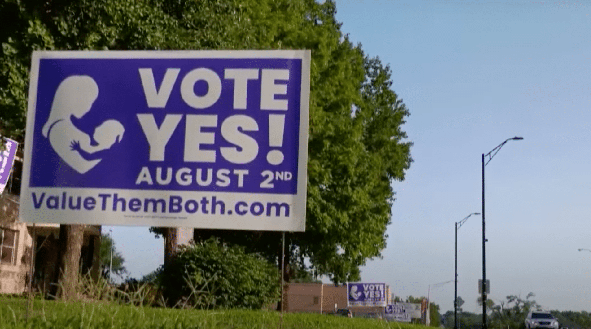 A sign pronounces support for a constitutional amendment to proclaim that a right to an abortion is not part of the Kansas Constitution (YouTube/Democracy Now!)