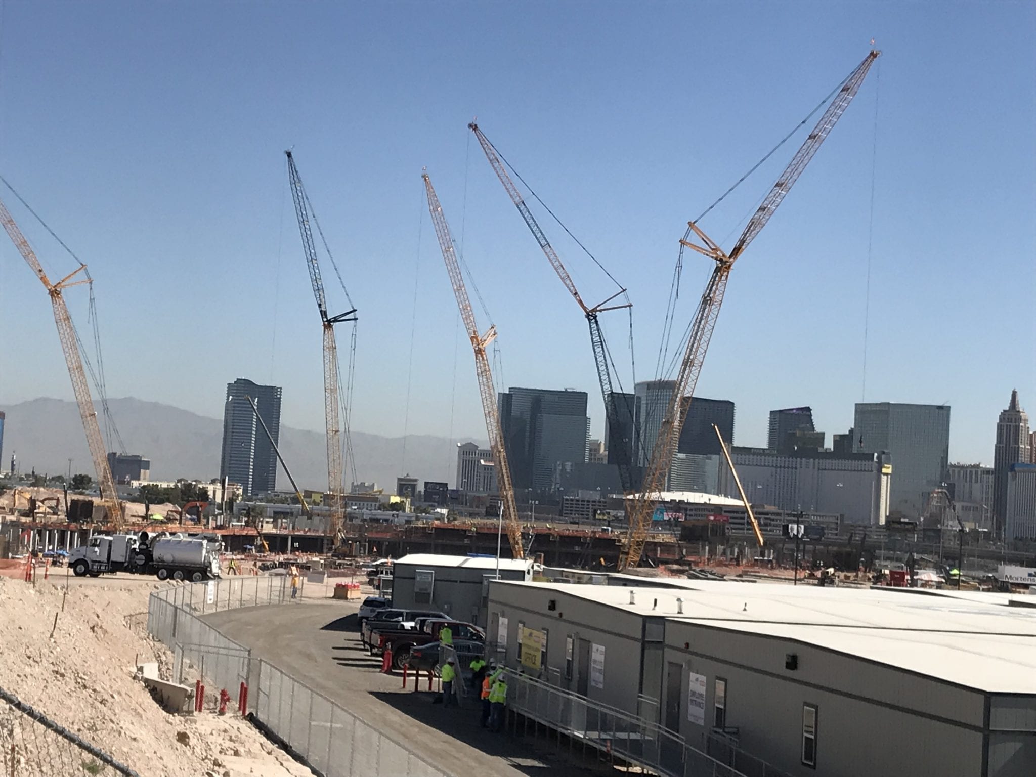 But down the Strip, at the corner or Russell Road and Dean Martin Drive, what was just a patch of debris-littered desert last summer is now bustling with activity. Dozens of trailers in one corner serve as offices and places of respite from the 110-plus degree heat, while cranes in the distance lift heavy pieces of steel that will form the shell of Las Vegas Stadium. A tower painted with the Raiders logo supplies water to the site, while several cement trucks wait to pour in one corner, their mixer drums spinning.