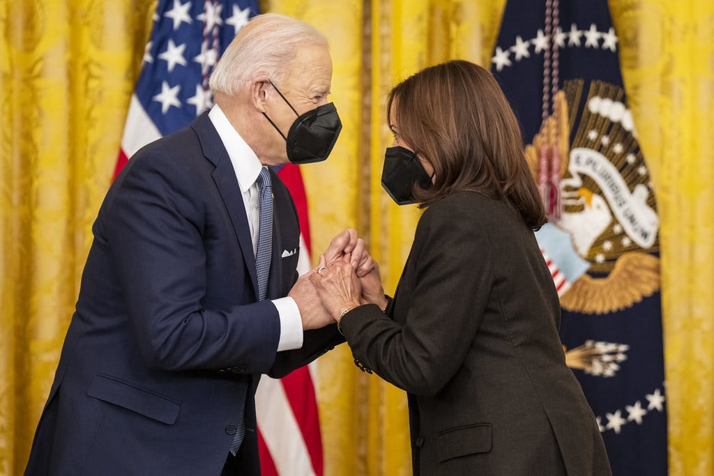 Vice President Kamala Harris greets President Joe Biden at a Black History Month celebration, Monday, February 28, 2022, in the East Room of the White House. (Official White House Photo by Adam Schultz)