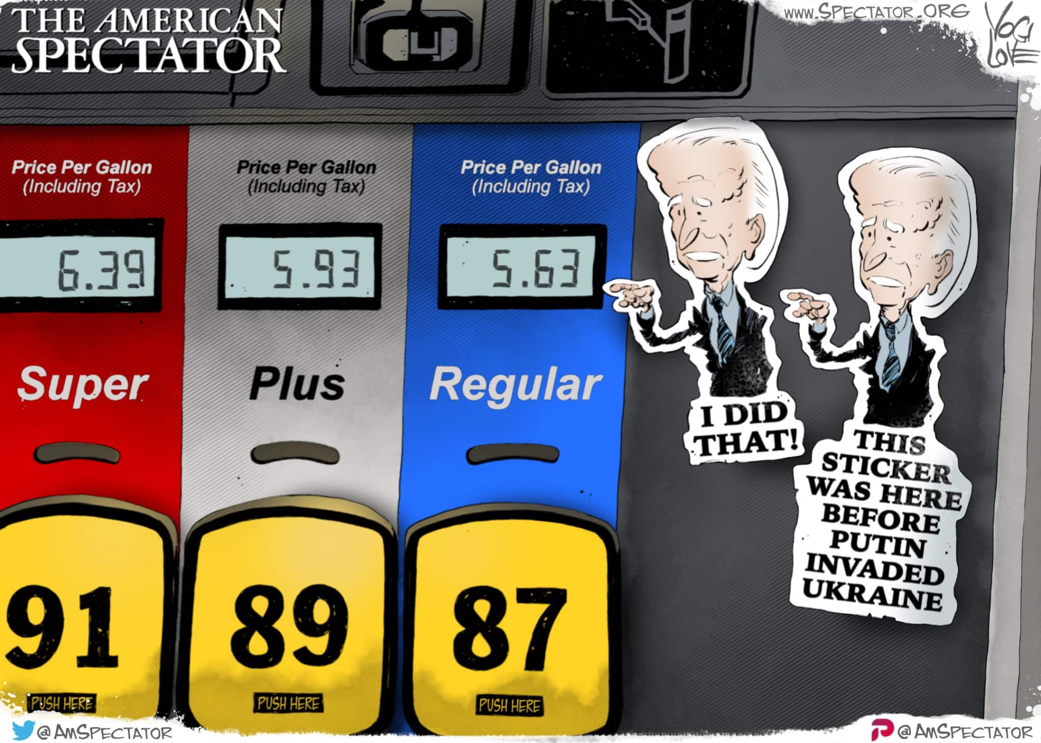 “Biden Sticker Shock,” editorial cartoon by Yogi Love for The American Spectator, April 19, 2022.