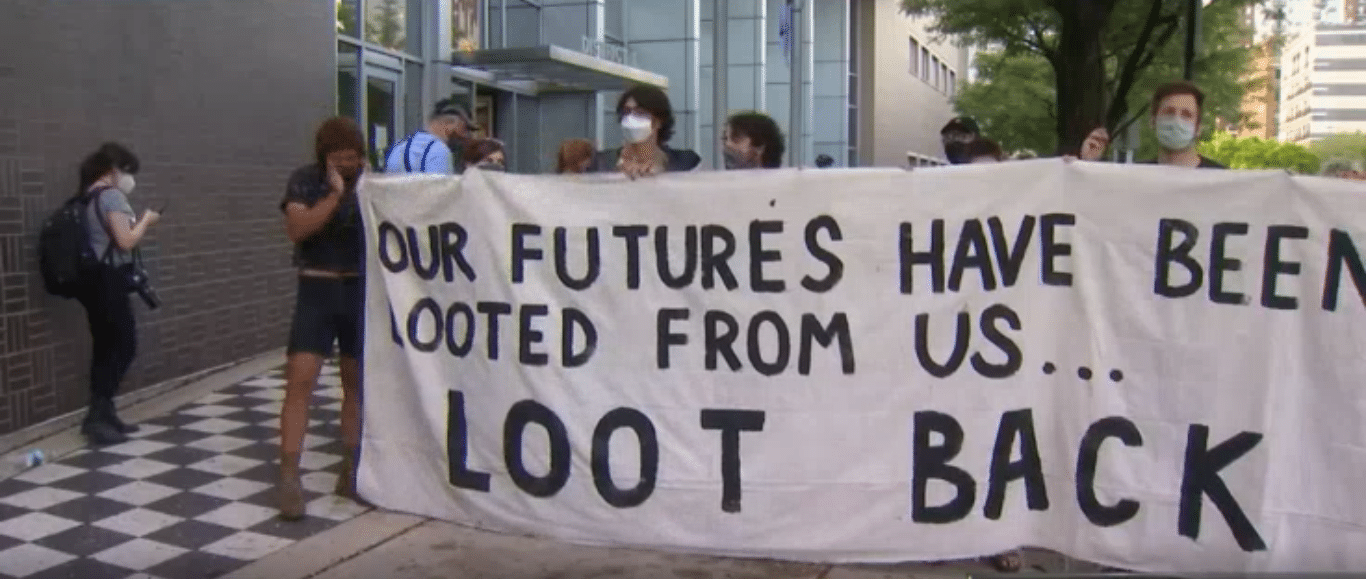 At the rally, protesters held up a banner defending the looters that said, “Our futures have been looted from us … loot back.” Monday’s rally was not just about protesting the imprisonment of the looters but a defense of their actions as legitimate.