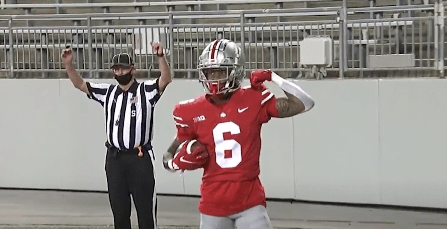Jameson Williams celebrates after a touchdown in Ohio State’s win over Rutgers, November 7, 2020 (YouTube screenshot)