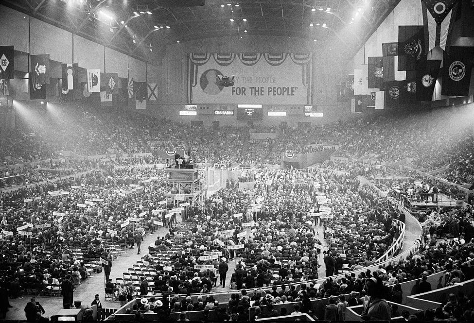 Well, use it I did. I handed my sign to my sister and went in the first door I saw, a service entrance, and wandered into what looked like a cavernous storeroom. I turned out to be just outside the entrance to the main floor, I saw a group of attractive young women, dressed up in matching black cocktail dresses, lined up four abreast like a high-school pom-pom troupe. This was the old days, when real bands played and real balloons festooned the hall’s ceiling. Sure enough, the gals were part of the “demonstration” that would spontaneously erupt the moment Nixon’s nomination was put forward later that evening.