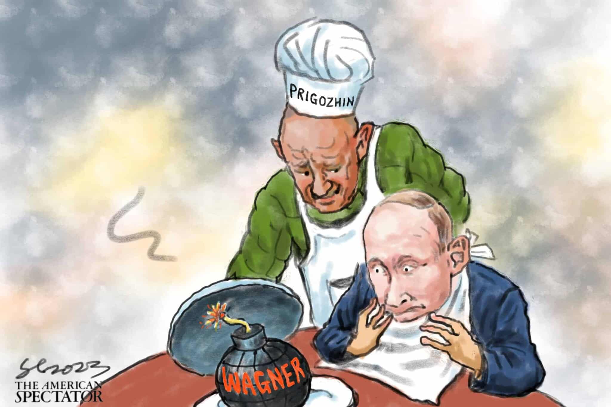 “Don’t Be a Kiev Chicken, Putin,” editorial cartoon by Shaomin Li for The American Spectator, June 25, 2023.