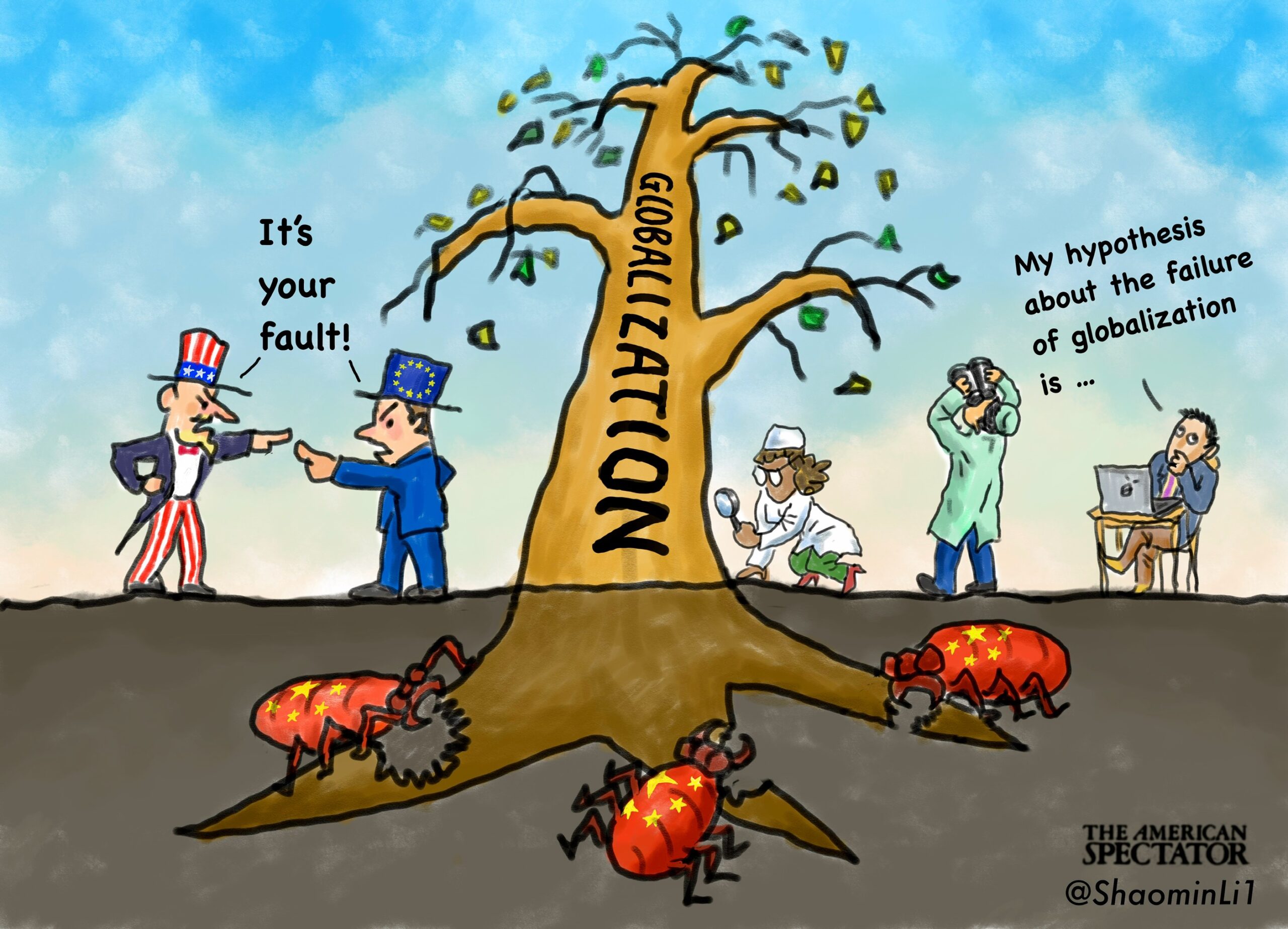 ‘Elites Diagnose Globalization’s Fall,’ editorial cartoon by Shaomin Li for The American Spectator on June 28, 2025.