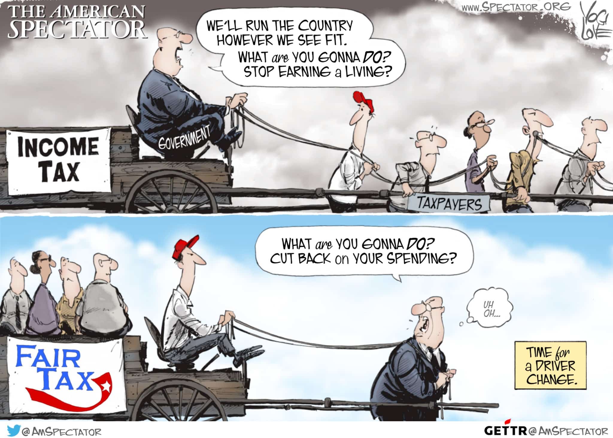 “FairTax Bandwagon,” editorial cartoon by Yogi Love for The American Spectator, Jan. 25, 2023.
