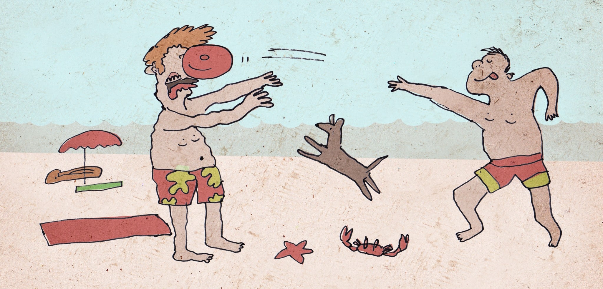 An extreme variant of the frisbee is “frisbee with dog.” The owner finds fun in throwing the disc and waiting for Bobby to bring it back to him. On paper, this is not such a bad idea. However, when put into practice on the beach, in addition to getting hit by a frisbee, you’ll also get a bite from Bobby for trying to take his toy away from him. The only thing that can save you is to carry a dog cookie somewhere in your swimsuit. But this is obviously only done by professional beachgoers.