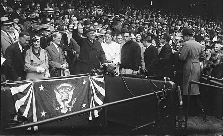 Washington’s last World Series, 1933: Franklin Roosevelt throws out the first ball in game three, Griffith Stadium, October 5th, with Senators and Giants managers Joe Cronin and Bill Terry. (Dept. of the Interior / public domain)