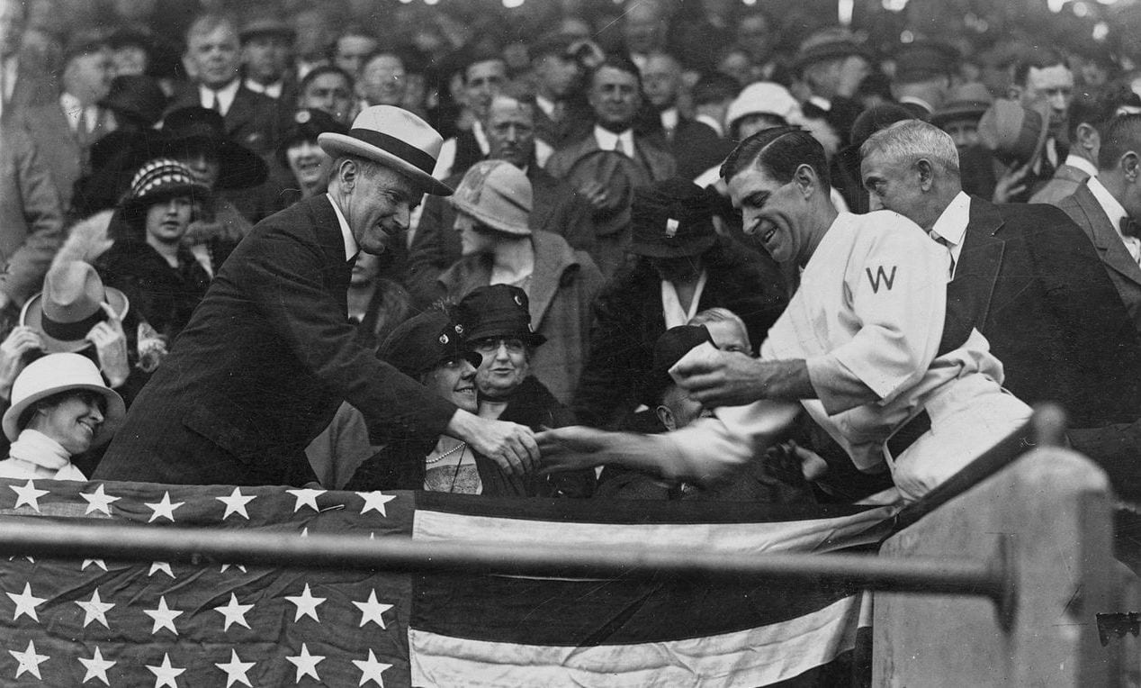 Washington’s best World Series, 1924: Calvin Coolidge with manager Bucky Harris and the first ball, game one, October 4. Actually, “Silent Cal’s” wife Grace was the baseball fan. When Muddy Ruel scored the winning run she leaped to her feet cheering. The President said, “My word,” and dropped his cigar. (Library of Congress / public domain)