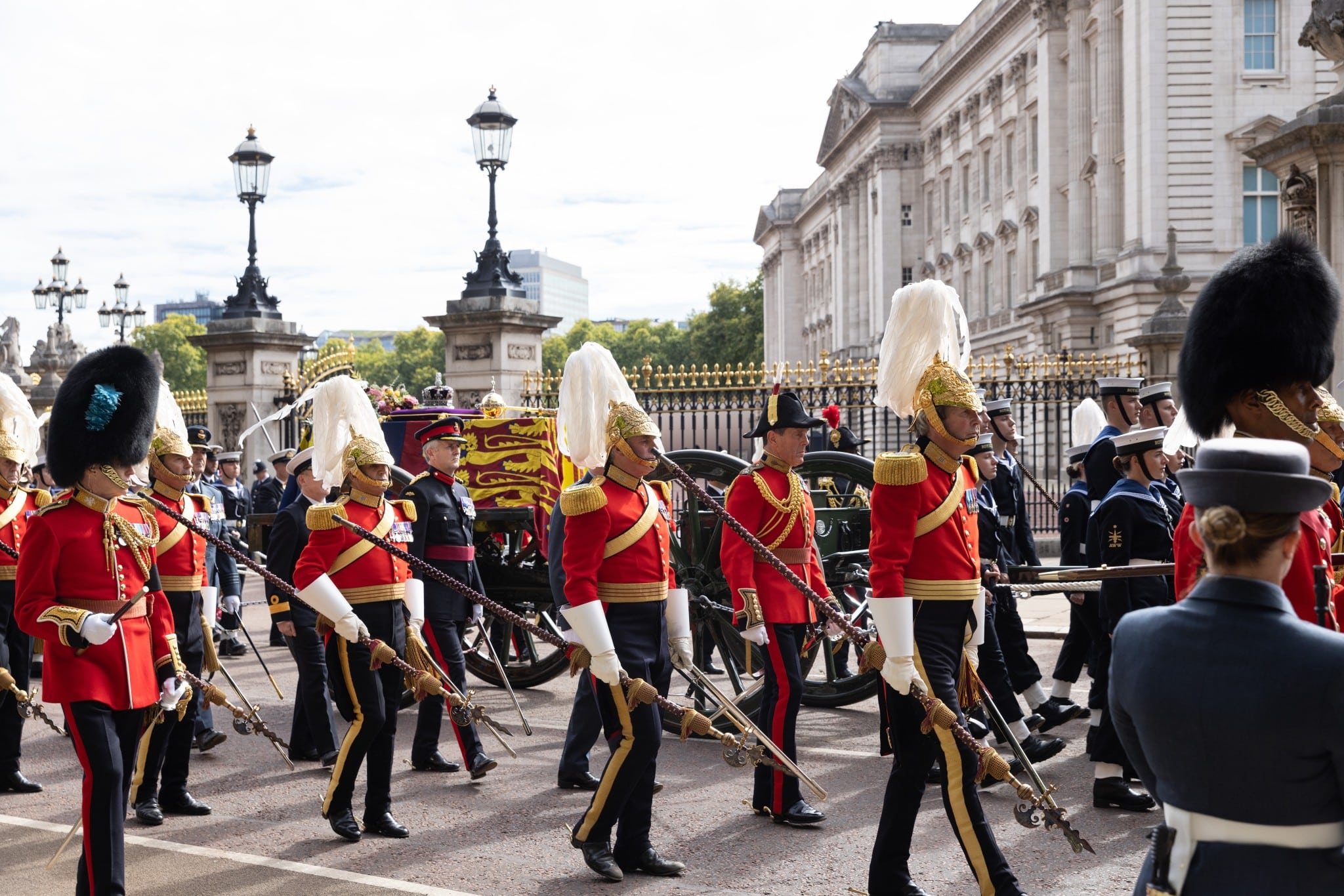 The queen’s farewell was awash in colors: Beefeaters in bright red livery flanked the memorial procession. One hundred forty-two Royal Navy sailors in dark blue uniforms used long white ropes to tug the light green State Funeral Gun Carriage that bore the departed monarch’s coffin. Atop this 121-year-old platform, a gold and burgundy royal standard draped the coffin, which was adorned with pink, yellow, and light orange flowers freshly clipped from the gardens at Buckingham Palace and Clarence House. The gold orb and scepter glittered beside the deep purple, diamond-encrusted Imperial State Crown.