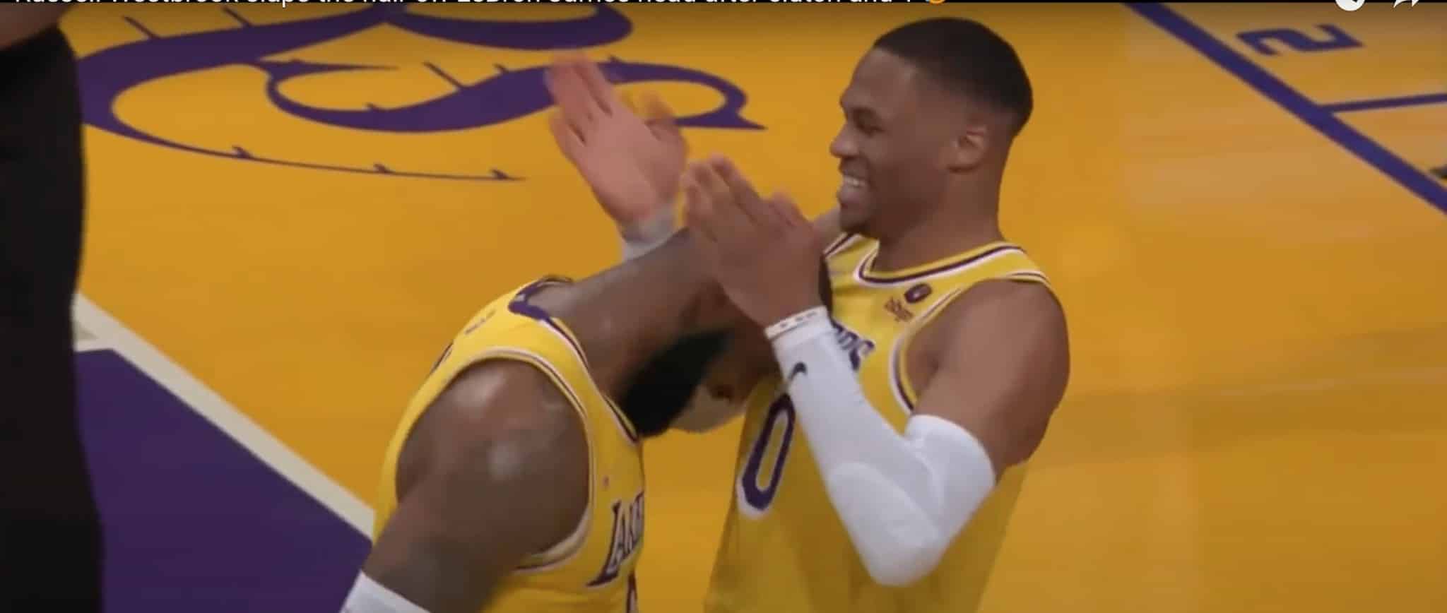 Lebron James and Russell Westbrook celebrate after a rare assist from the latter, Jan. 18, 2022 (Chaz NBA/YouTube)