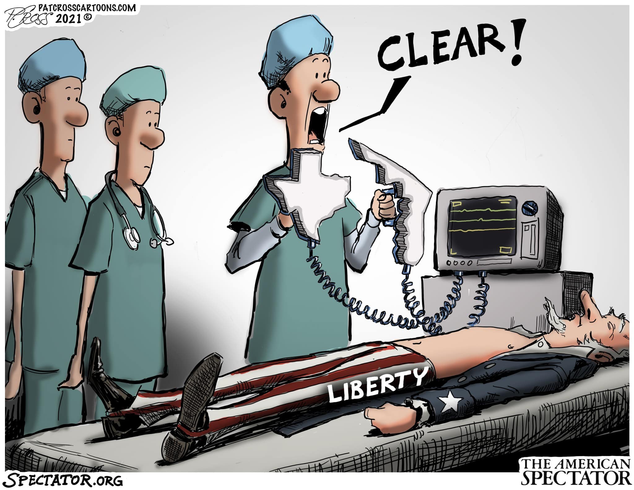 “Liberty’s Last Hope,” editorial cartoon by Patrick Cross for The American Spectator, December 14, 2021.