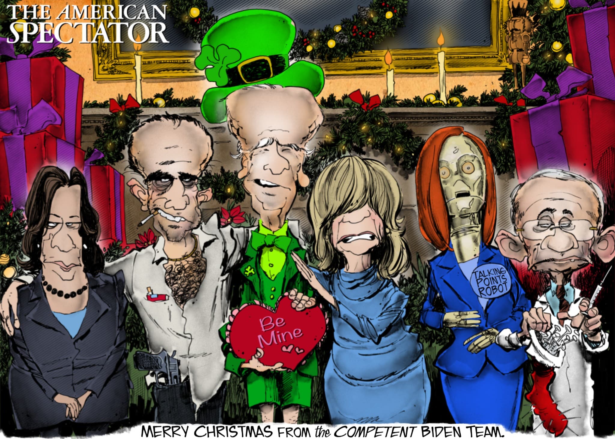 “Merry Christmas From the Competent Biden Team,” editorial cartoon by Yogi Love for The American Spectator, December 23, 2021.