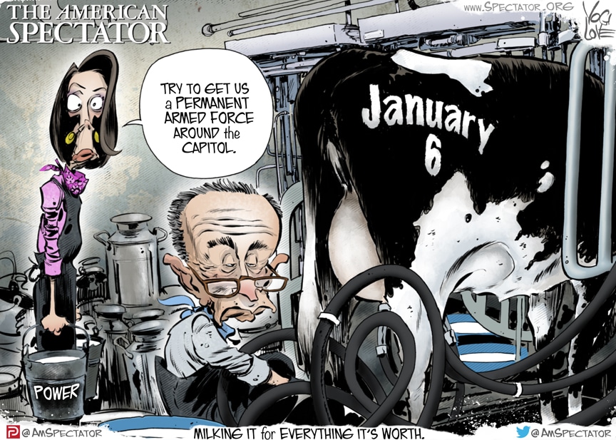 “Milking January 6,” editorial cartoon by Yogi Love for The American Spectator, March 19, 2021.