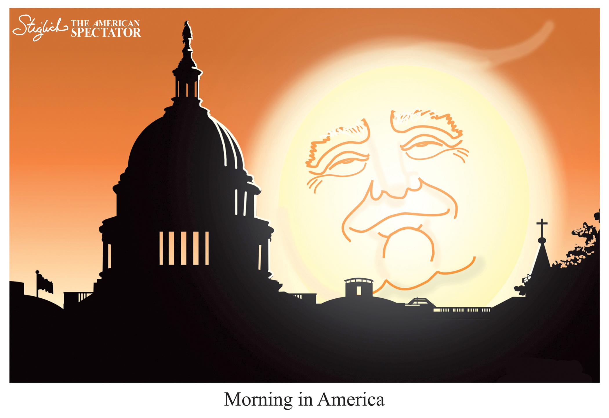 “Morning in America,” editorial cartoon by Tom Stiglich for The American Spectator, Nov. 6, 2024.