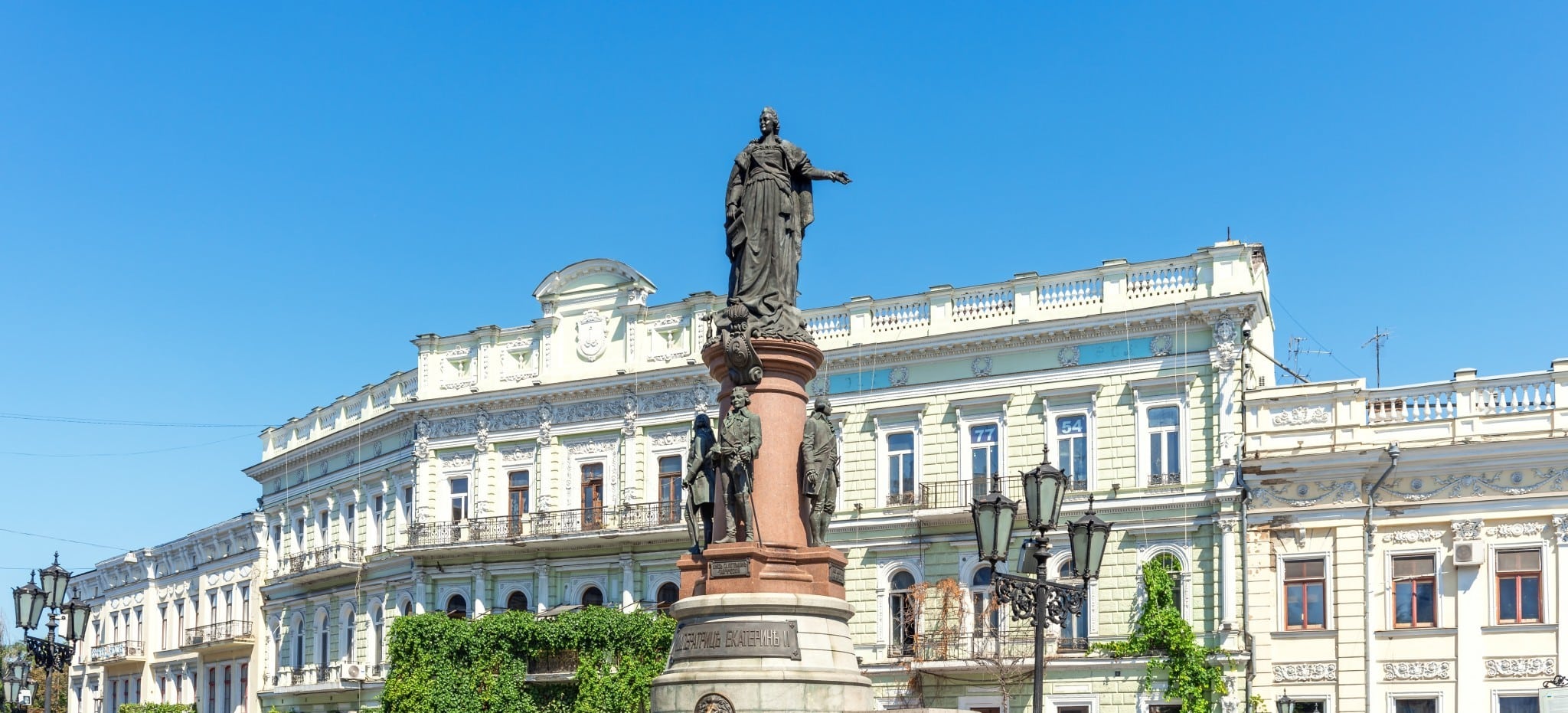 History is repeating itself this evening, as crowds assemble in Katerynynska Square for the unveiling of a recast Monument to the Founders of Odesa, painstakingly recreated by a team led by Kyiv-based sculptors Oleg Chernoivanov and Nikolay Oleynik. Smiling girls dressed in the green uniforms and gold-trimmed tricorn hats of the imperial-era Preobrazhensky Life Guards Regiment stand at attention in a ring around the memorial, as actors in 18th-century attire stroll about the piazza. The assemblage is not quite so large, nor as ebullient as the one a century ago, the eccentric cosplay lends an ersatz feel to the proceedings, and there is another feature that was not present during the 1900 ceremony: a police cordon protecting the event from irate protestors.
