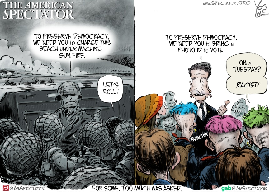 “Photo ID: Too Much to Ask?,” editorial cartoon by Yogi Love for The American Spectator, July 2, 2021.
