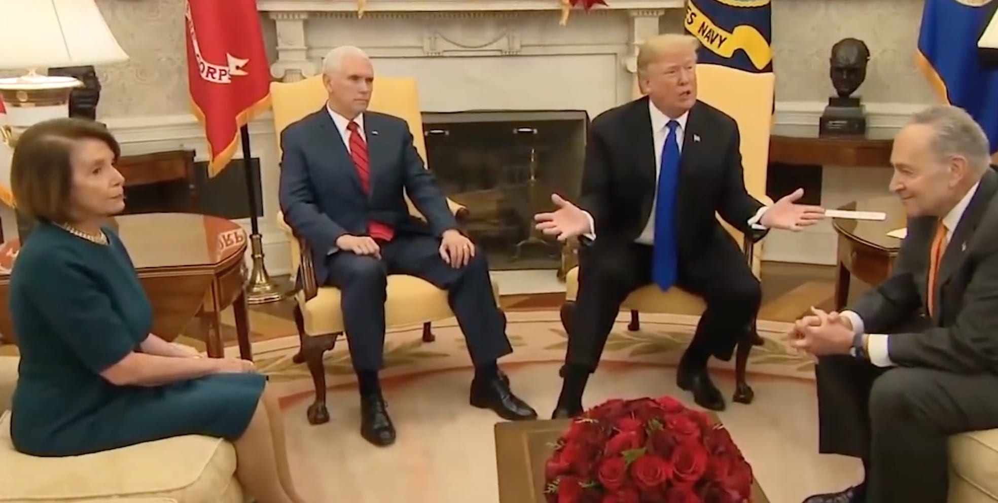 The Tuesday showdown between President Trump and Senate Minority Leader Chuck Schumer (D-NY) and incoming House Speaker Nancy Pelosi (D-Cal) was not supposed to be a press event but Trump, ever the stage manager, made sure it was. He turned it into a good political scrap.