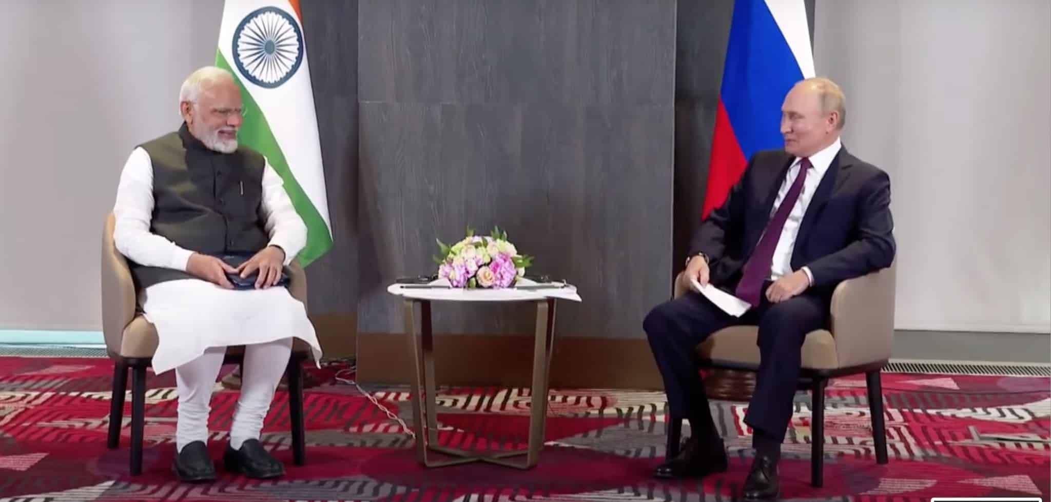 Indian Prime Minister Modi and Russian President Vladimir Putin in Samarkand, Uzbekistan, on Sept. 16 (PMO India/YouTube)