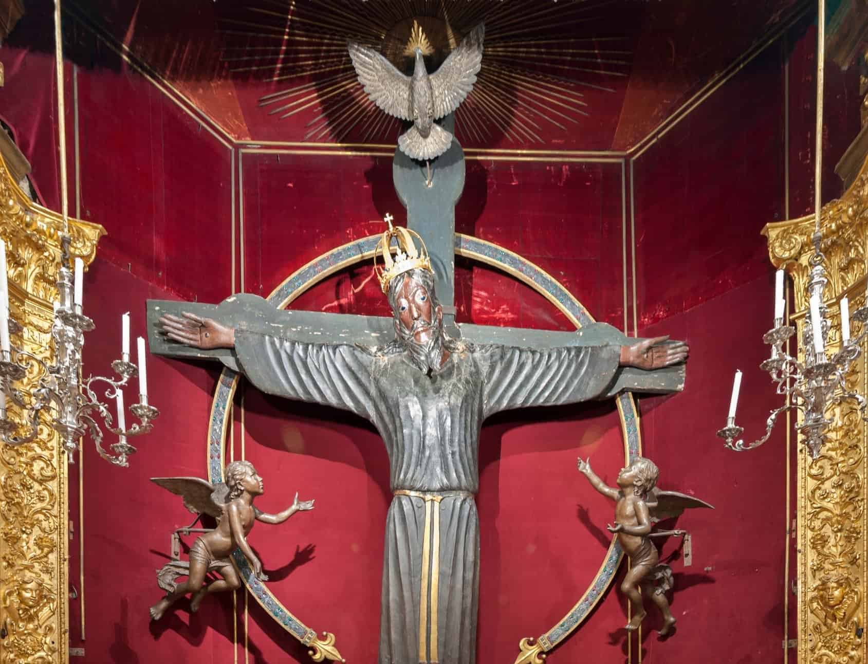 Nearly eight feet tall, the Volto Santo looms large both in real life and in the mythology of northern Italy. According to medieval legend, the crucifix was carved by Nicodemus, the Pharisee-turned-disciple in the Gospels, after the death of Christ. The story goes that Nicodemus carved the corpus from memory but struggled to complete the face, even though he was one of the Lord’s followers. He prayed for divine assistance, and awoke the next day to find that angels had carved the statue’s face in the perfect image of Jesus.