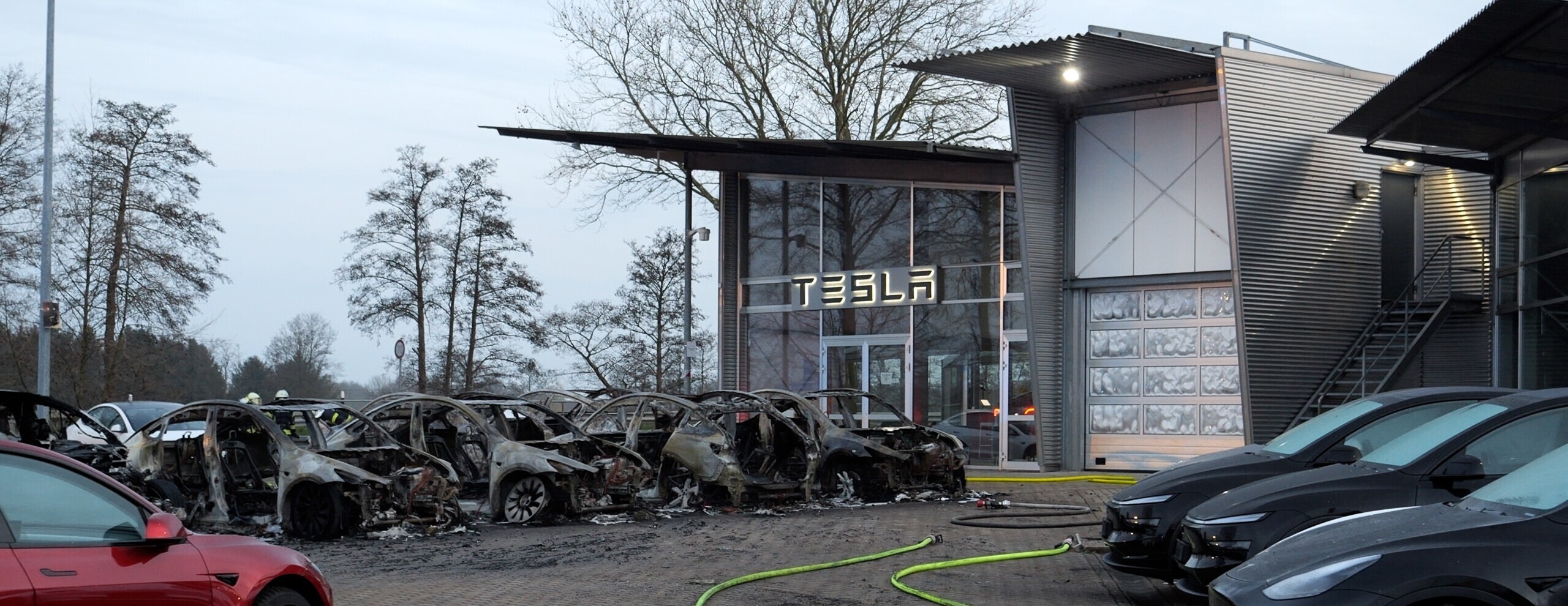 Firebombed Tesla dealership in Ottersberg, Niedersachen, Germany on March 29, 2025 (Joern Hueneke/Shutterstock)