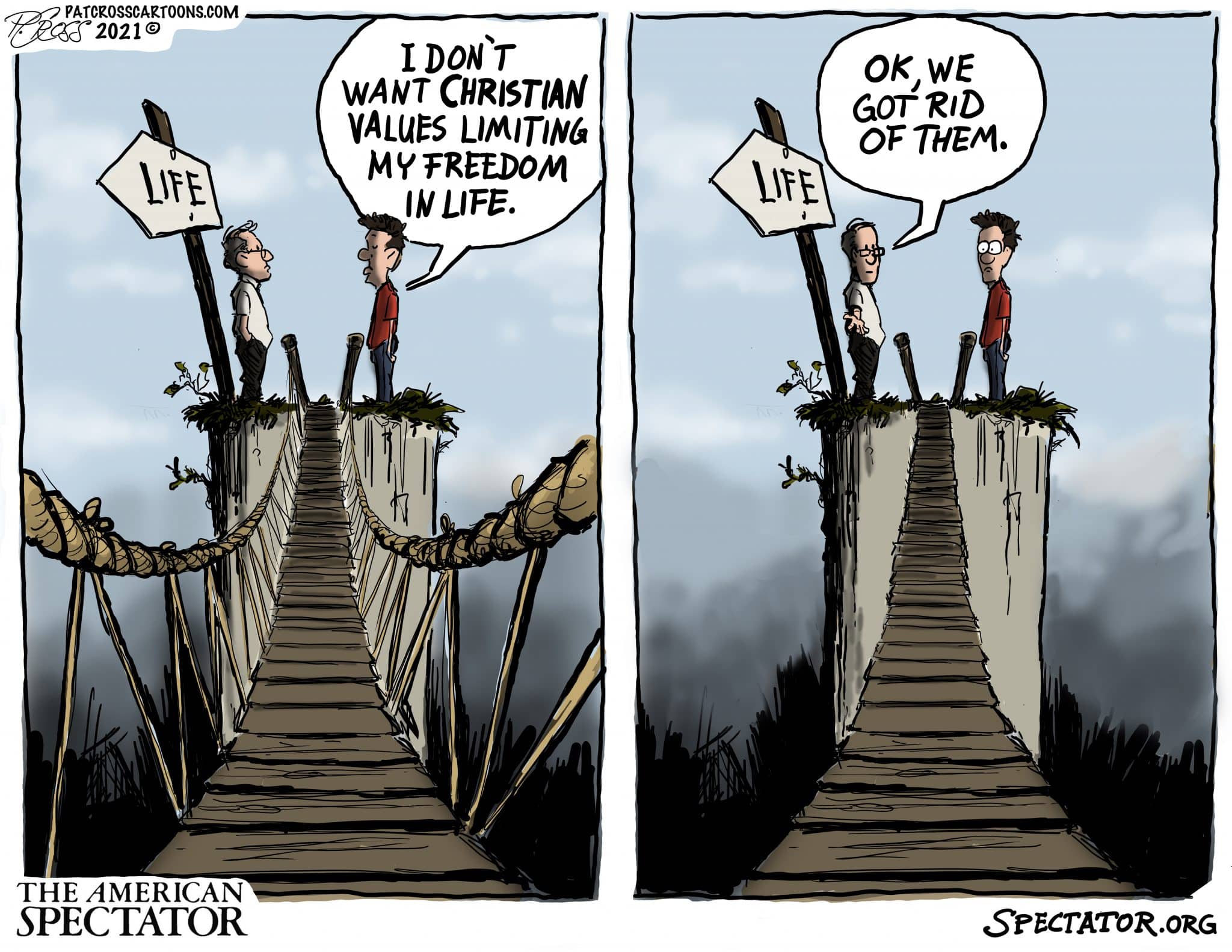 “The Bridge of Life,” editorial cartoon by Patrick Cross for The American Spectator, June 13, 2021, spectator.org