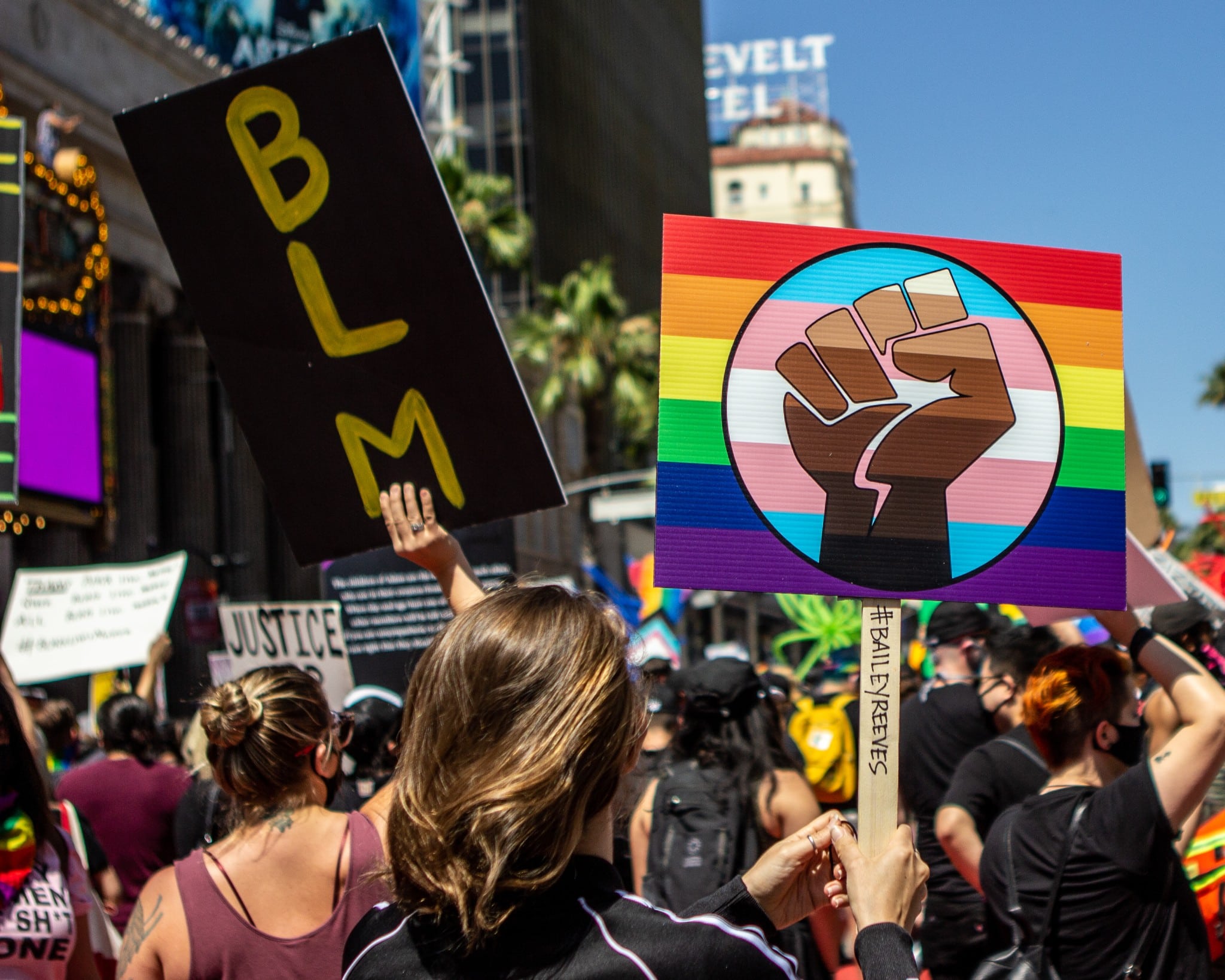 Protesters hold a BLM sign and rainbow fist sign at the All Black Lives Matter march in Hollywood, California, on June 14, 2020. (Shutterstock/GrandAve)