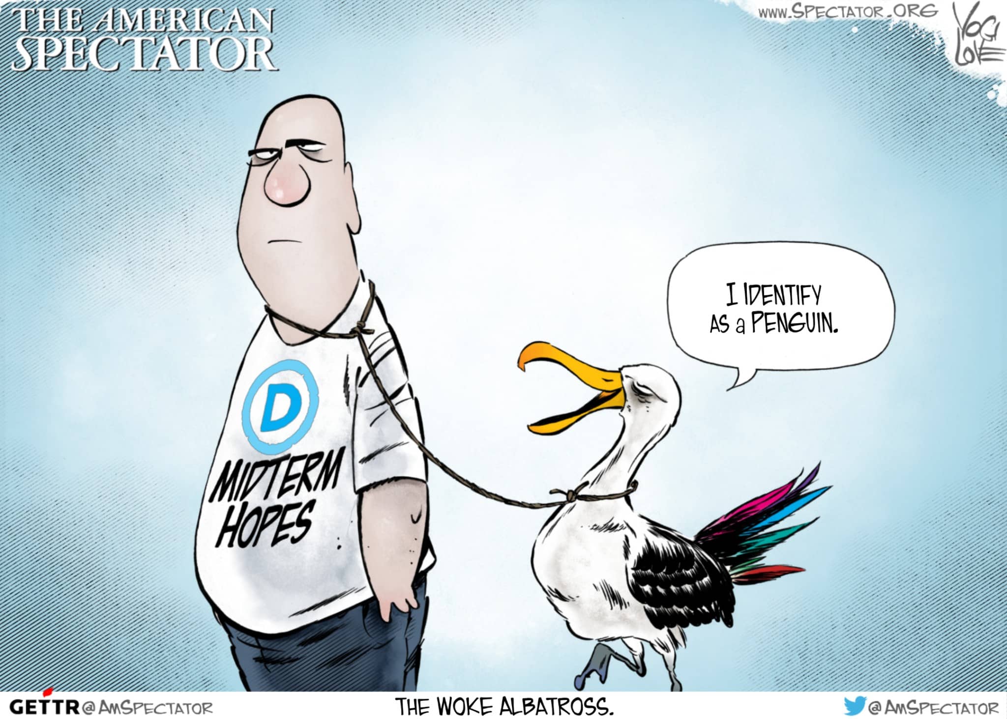 “The Woke Albatross,” editorial cartoon by Yogi Love for The American Spectator, Sept. 26, 2022.