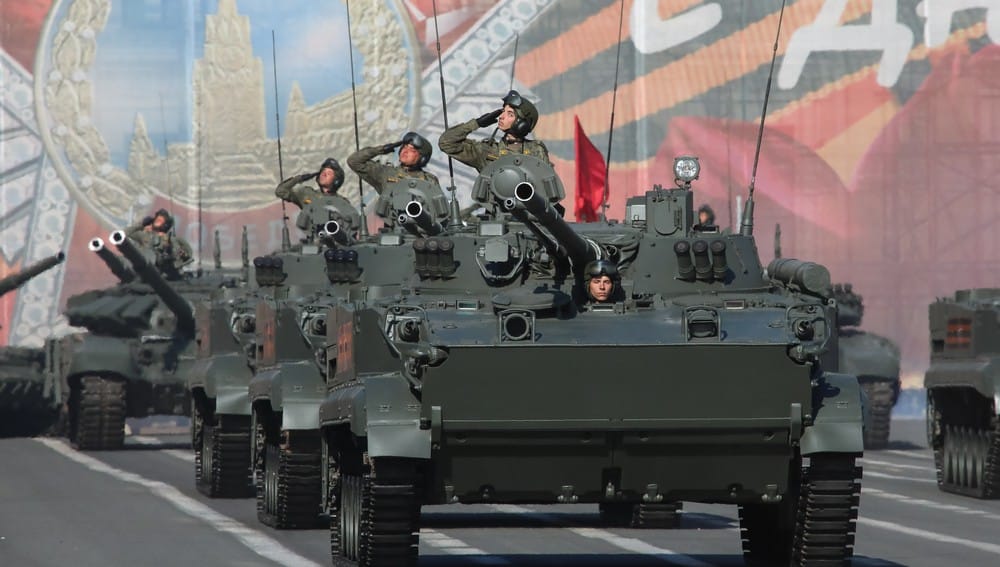 Russian soldiers ride in a military parade in Saint Petersburg, Russia, on May 7, 2019. (Shutterstock/Pimen)