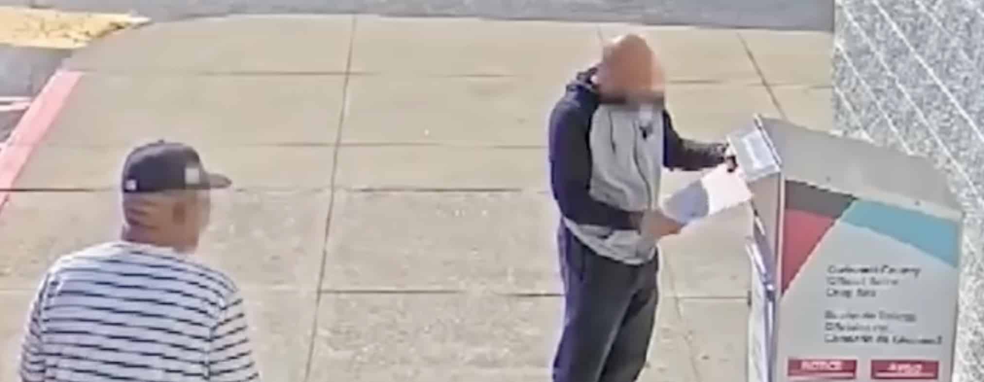 A mule wearing rubber gloves prepares to stuff ballots into a Fulton County, Georgia, drop box during early voting before Election Day 2020 (Screenshot from official government-security video).