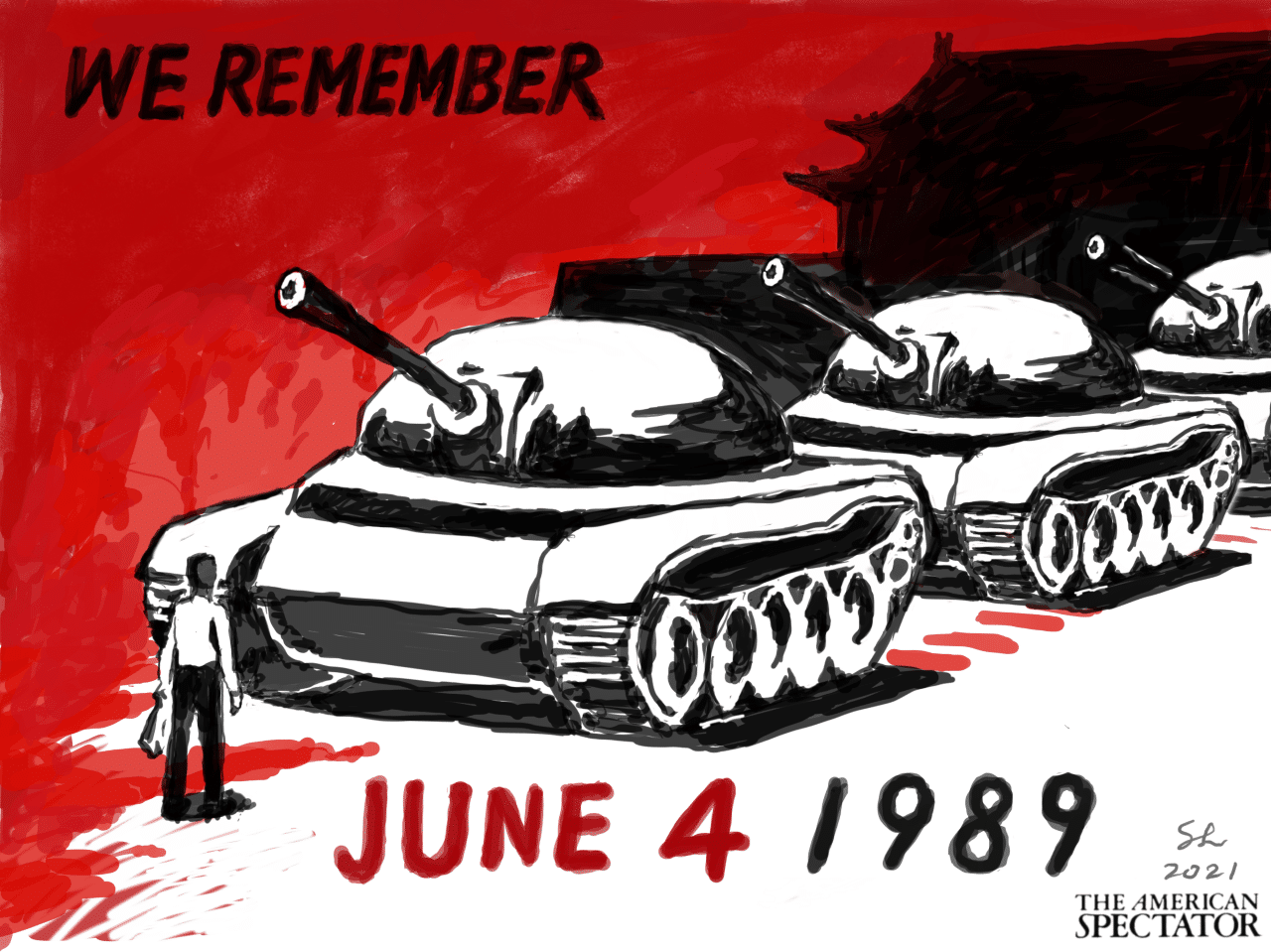 “Tiananmen Square, 32 Years Later,” editorial cartoon by Shaomin Li for The American Spectator, June 4, 2021.