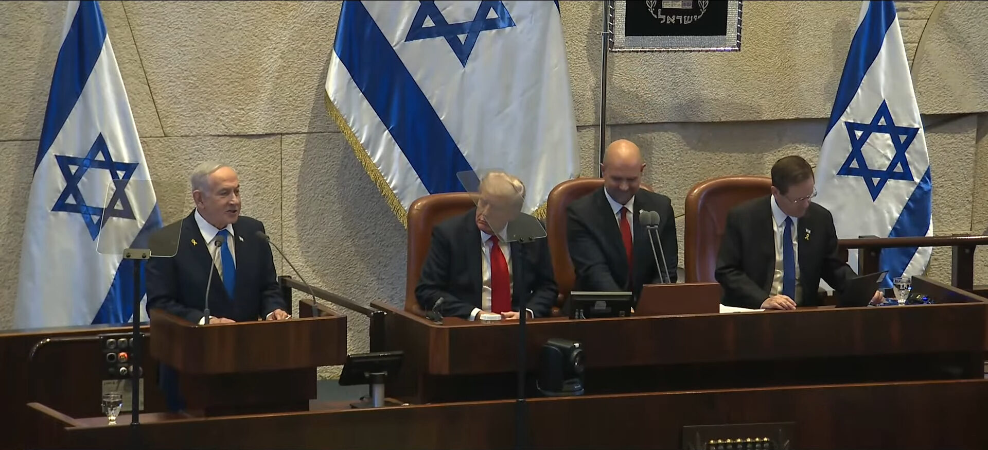 President Donald Trump, Israeli Prime Minister Benjamin Netanyahu, and other Israeli leaders addressed the Knesset on Oct. 13, 2025 (The White House/YouTube)