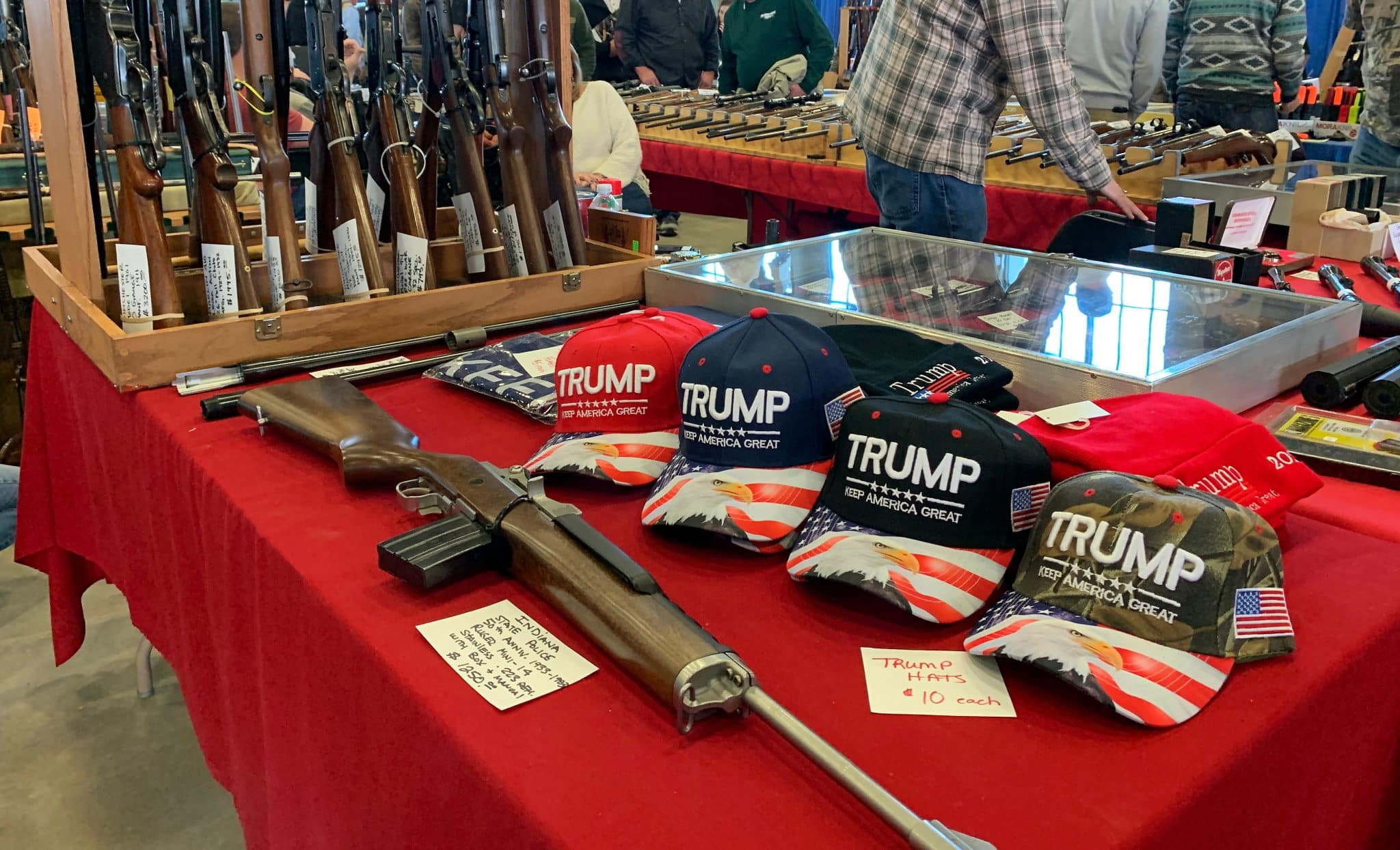 Trump hats near gun display, Tulsa, Oklahoma (damann/Shutterstock.com)