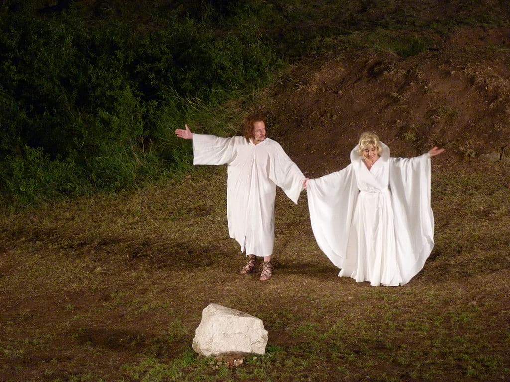 At dusk, a member of the Wichita Tribe signed the Lord’s Prayer in Plains Indian Sign Language (PISL). Then, music blared over loudspeakers, and a spotlight moved through vignettes in a half-mile area, including the nativity in Bethlehem, the mount of Jesus’s titular sermon, and Golgotha, the site of the crucifixion. The expansive tableau had more than one actor depicting each main character, and a cast of Roman soldiers, angels, Pharisees, and others pantomimed scenes with sweeping gestures. The voice actors read the script in a stentorian manner that evoked a biblical epic like The Ten Commandments.