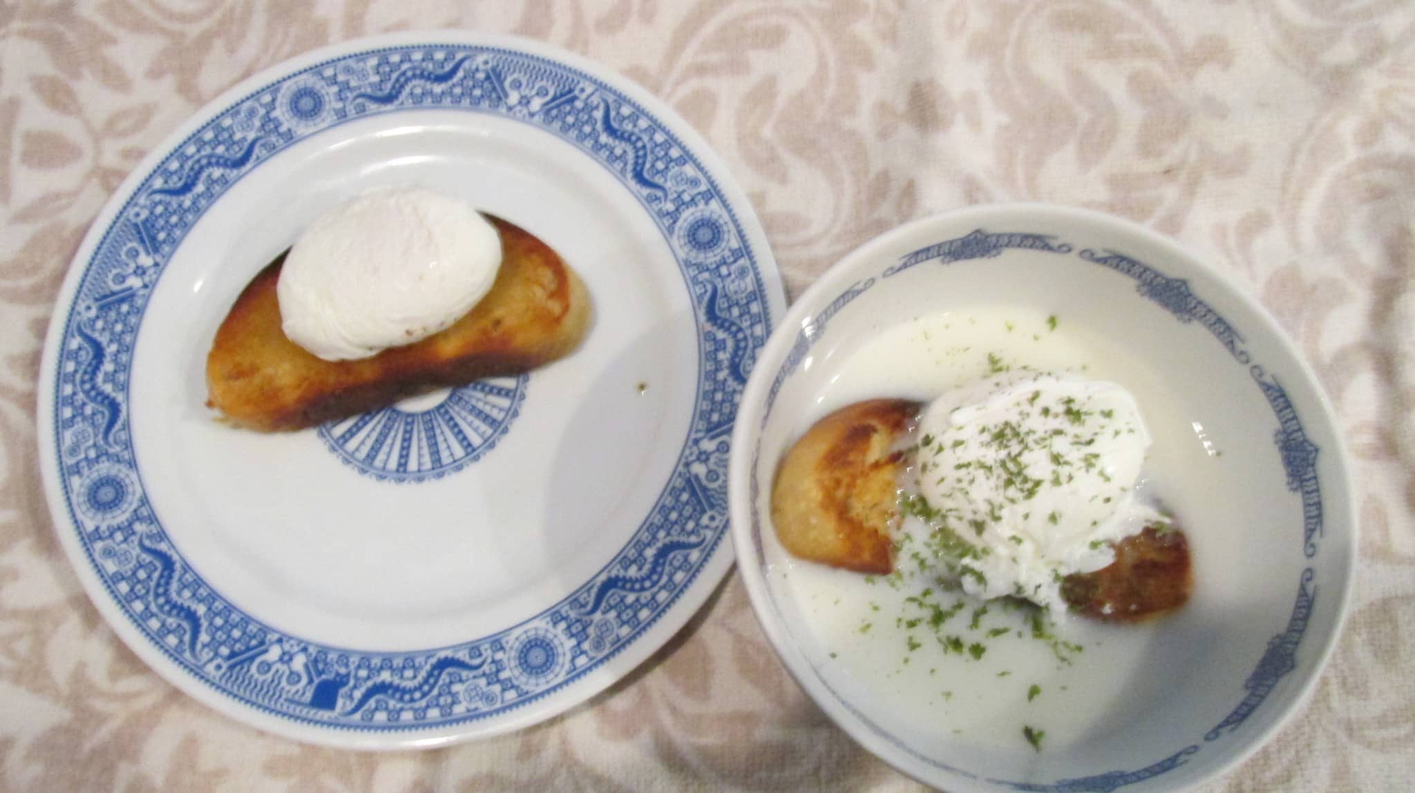 This is a delicious, comforting, satisfying, and oddly filling dish (after all, it’s just milk, egg, and a scrap of bread) — and I can fully appreciate its beneficial effects on the physical health and psyche of invalid patients. The “enhanced version” is almost too substantial for a first course and today would make a meal all by itself, served with a salad and a basket of bread or rolls.