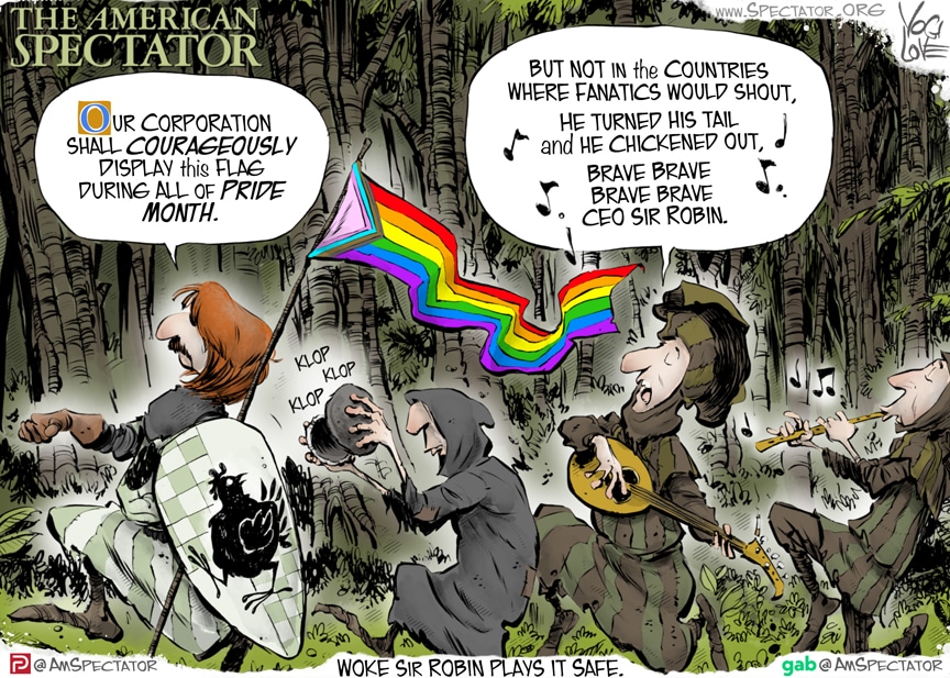 “Woke Sir Robin,” editorial cartoon by Yogi Love for The American Spectator, June 9, 2021.