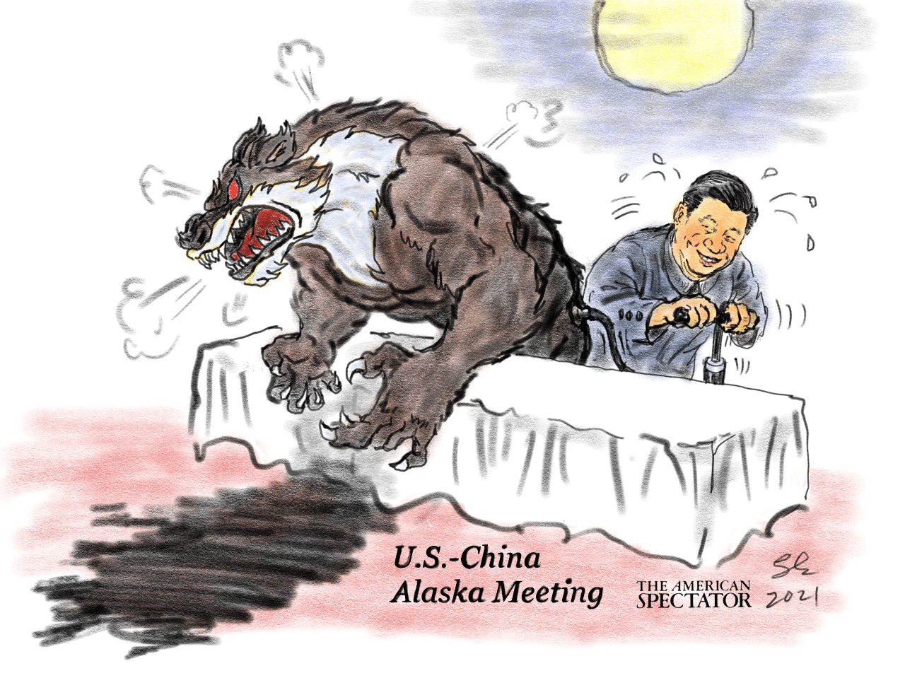 “Xi’s Wolf Warrior Diplomats,” editorial cartoon by Shaomin Li for The American Spectator, March 22, 2021.